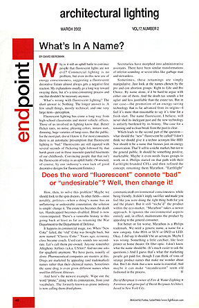 from Architectural Lighting, March 2002Why is it still an uphill battle to convince people that fluorescent lights are not evil? Commercial lighting is no problem, but even in this new era of energy consciousness, suggesting a fluorescent decorative fixture almost always gets a negative first reaction. My explanations usually go a long way toward swaying them, but it's a time consuming process and one that shouldn't be necessary anymore.
