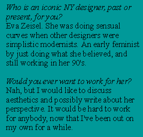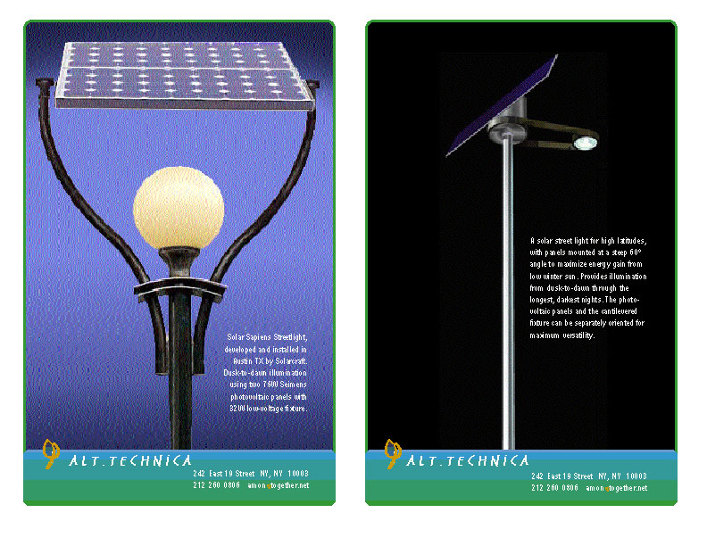 shows. One of them wa DB: So, were you into the environmental part of it before you joined IDSA, or did they bring that to you? AA: I guess it had probably always been part of my consciousness, but it had never been part of my work. And, y'know, I was a design advocate, but part of me thought that this whole thing of making corporations more competitive, making America strong through selling more products – through competition -- there was something that wasn't ringing true for me (laughs). And the environmental thing gave me more of a reason for what I was doing in design. DB: And you just said, "who else was going to do it?" It's a good thought because solar power isn't often thought of as an art form; we tend to think of it as a technology. AA: The truth is, solar has got to become more of a thing that people become more comfortable with...or think [that] it's exciting and sexy; it's got to be at the same level. LG: It's got to be high design. AA: You don't get the same sort of money going into the design.…it's not the [kind of] money that Sony's putting into their design. LG: How does that approach play into your work? AA: Right now I'm working on a controller, which is a piece of equipment, for the NY Energy Research and Development Authority [NYS ERDA]. DB: It's one of their cost sharing programs? AA: Yes. It would be a consumer oriented "brain" or circuit board of the system, that takes the energy from the solar panel, and either puts it into the battery or directs it to the load. DB: That sounds more like electronics design than product design. AA: But it's very much [about] user-interface. And right now, the ones that they have on the market are very primitive. They have these items where you have to strip the wires, and screw things in, and things that consumers don't really want to do. I mean, I don't want to do those. (laughter) DB: Is this the equivalent of designing the box that